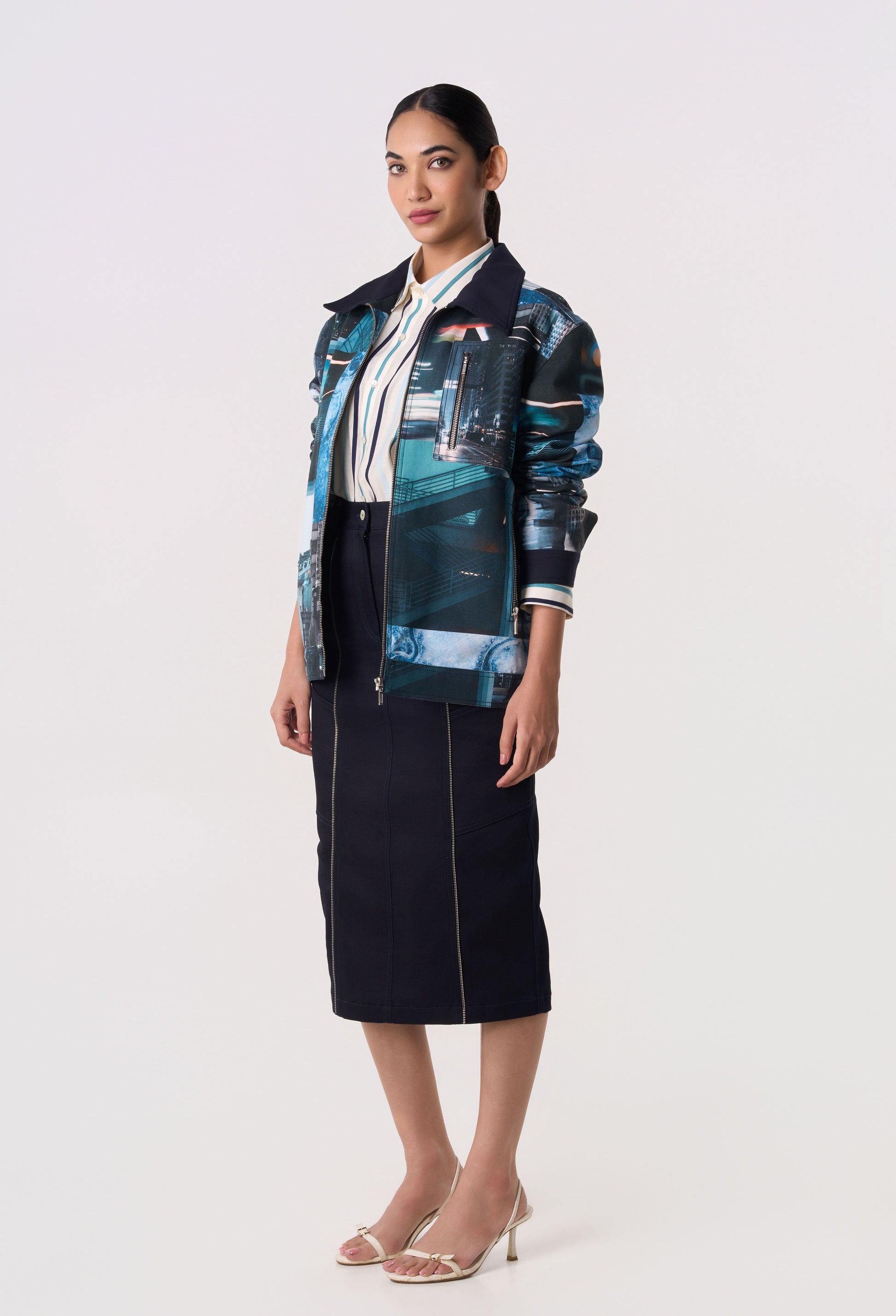A long sleeved shacket with a zipper closure and patch pockets.