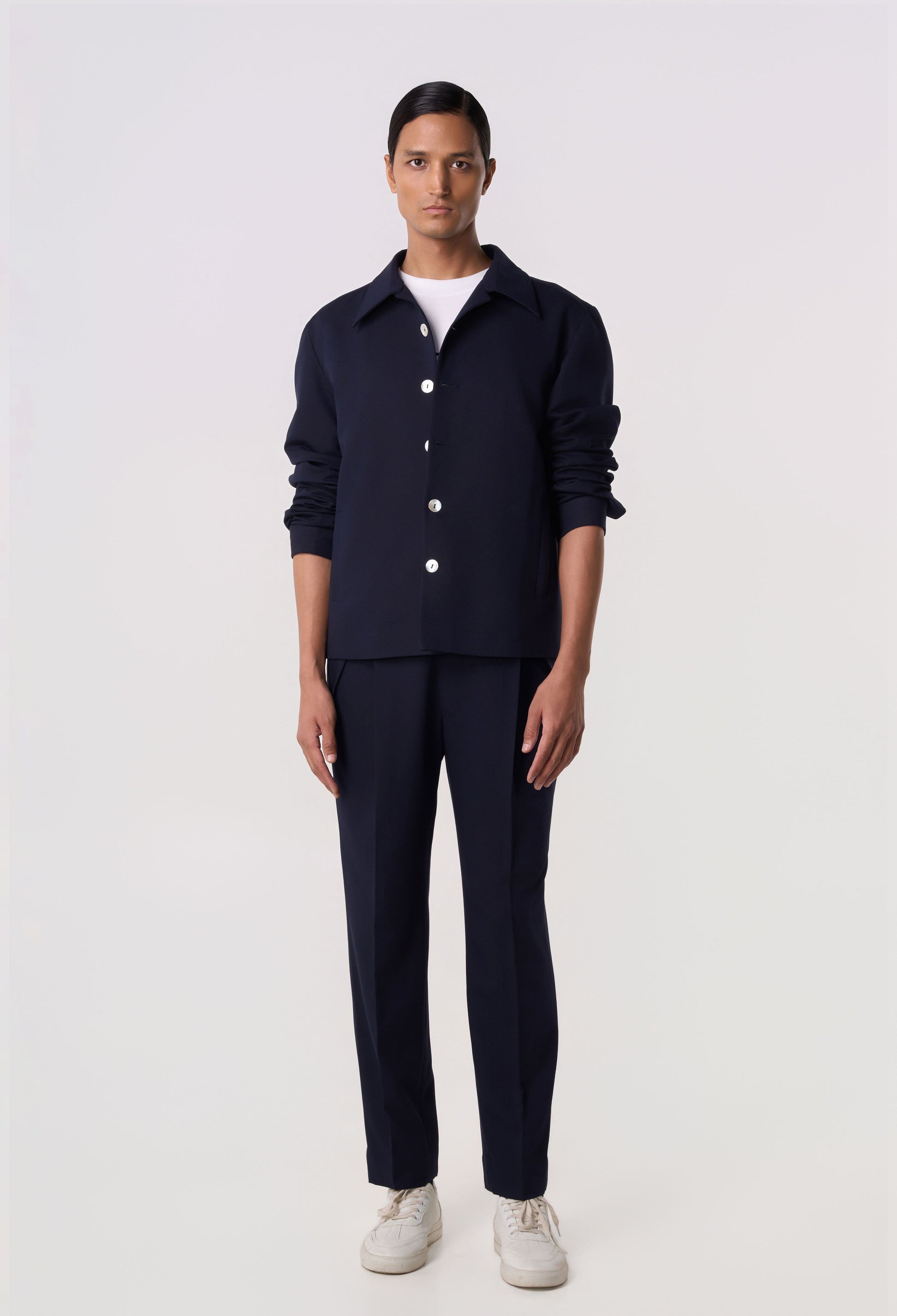 A relaxed fit cropped shacket with contrast buttons and piping details.