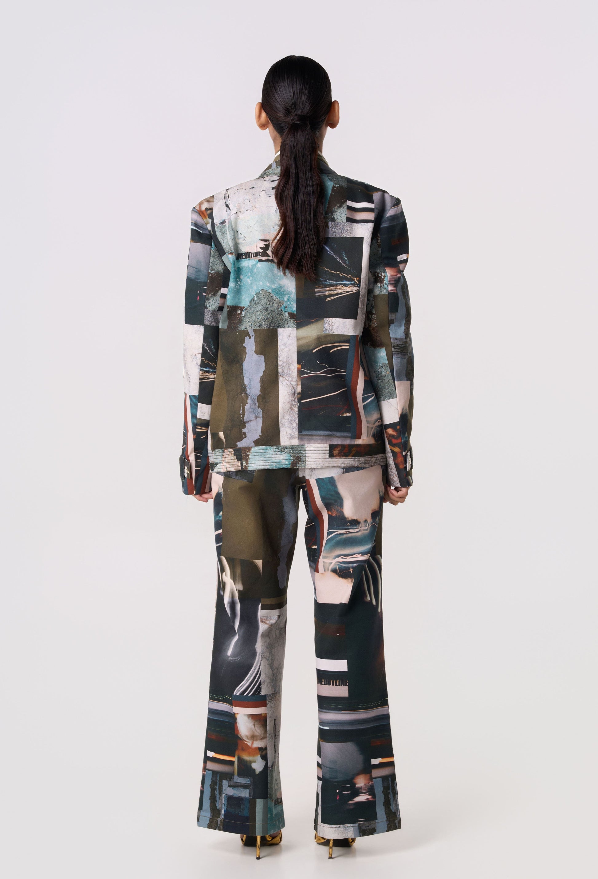 A casual two-button blazer with all over digital patchwork print and belt accents at the waistband and sleeves..