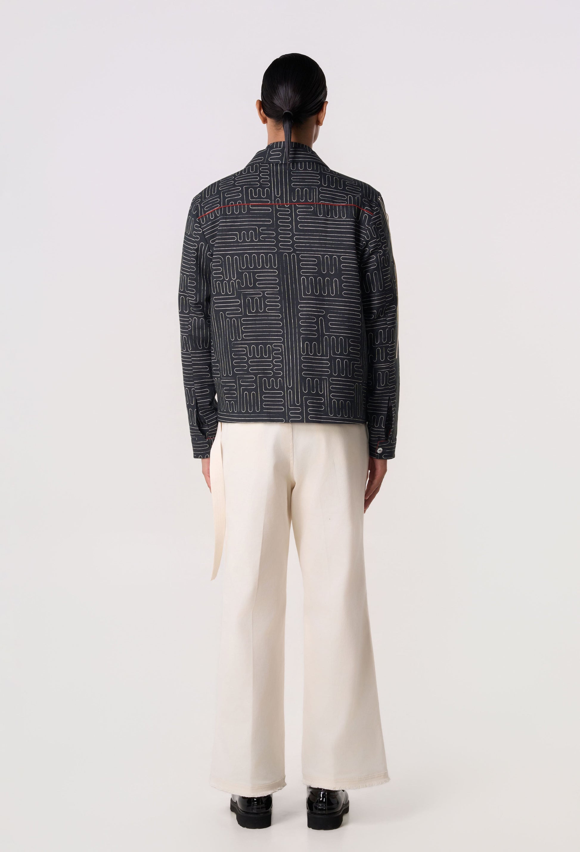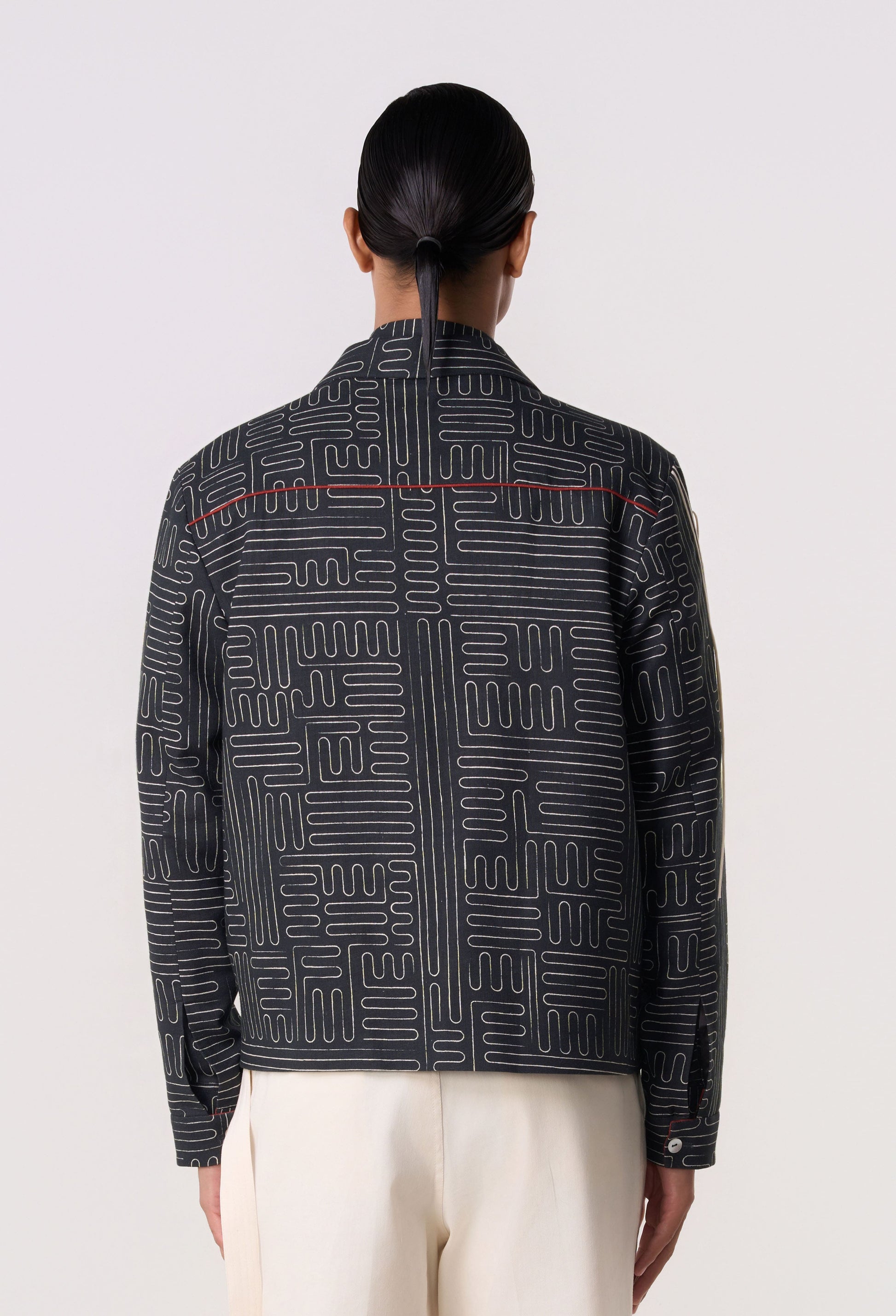 A long sleeve shacket with an all over digital print and white chanderi dori's highlighting certain parts of the print.