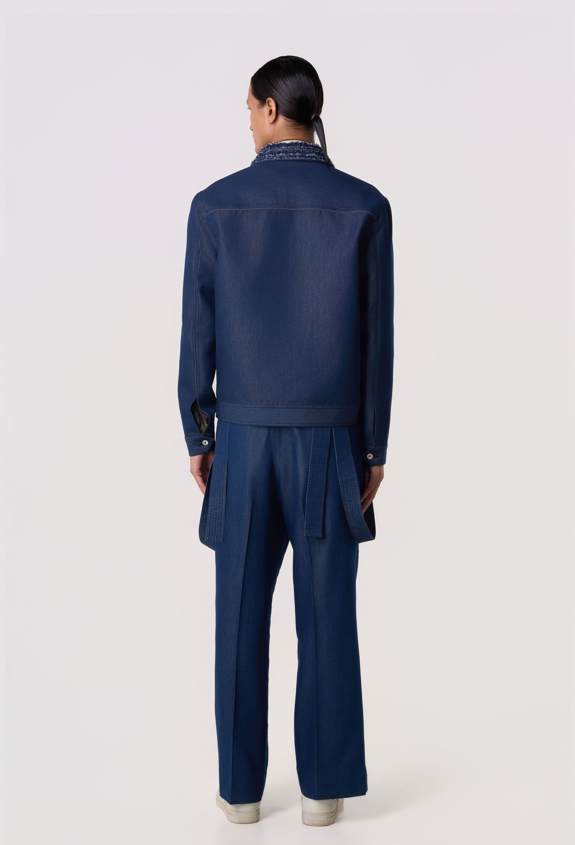 A long sleeve concealed placket shacket with distressed denim panels along the front yoke and collar.
